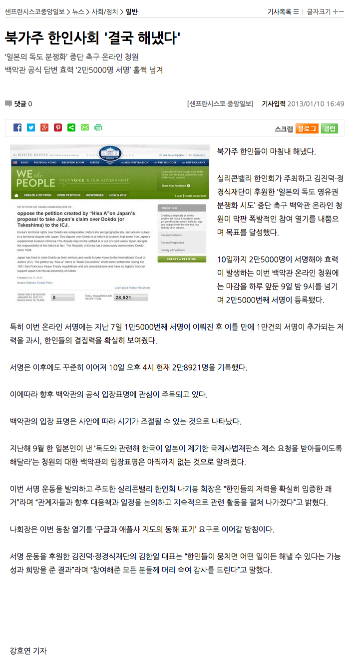 ‘일본의 독도 분쟁화’ 중단 촉구 온라인 청원 백악관 공식 답변 효력 ‘2만5000명 서명’ 훌쩍 넘겨 북가주 한인들이 마침내 해냈다. 실리콘밸리 한인회가 주최하고 김진덕·정경식재단이 후원한 ‘일본의 독도 영유권 분쟁화 시도’ 중단 촉구 백악관 온라인 청원이 막판 폭발적인 참여 열기를 내뿜으며 목표를 달성했다. 10일까지 2만5000명이 서명해야 효력이 발생하는 이번 백악관 온라인 청원에는 마감을 하루 앞둔 9일 밤 9시를 넘기며 2만5000번째 서명이 등록됐다. 특히 이번 온라인 서명에는 지난 7일 1만5000번째 서명이 이뤄진 후 이틀 만에 1만건의 서명이 추가되는 저력을 과시, 한인들의 결집력을 확실히 보여줬다. 서명은 이후에도 꾸준히 이어져 10일 오후 4시 현재 2만8921명을 기록했다. 이에따라 향후 백악관의 공식 입장표명에 관심이 주목되고 있다. 백악관의 입장 표명은 사안에 따라 시기가 조절될 수 있는 것으로 나타났다. 지난해 9월 한 일본인이 낸 ‘독도와 관련해 한국이 일본이 제기한 국제사법재판소 제소 요청을 받아들이도록 해달라’는 청원의 대한 백악관의 입장표명은 아직까지 없는 것으로 알려졌다. 이번 서명 운동을 발의하고 주도한 실리콘밸리 한인회 나기봉 회장은 “한인들의 저력을 확실히 입증한 쾌거”라며 “관계자들과 향후 대응책과 일정을 논의하고 지속적으로 관련 활동을 펼쳐 나가겠다”고 밝혔다. 나회장은 이번 동참 열기를 ‘구글과 애플사 지도의 동해 표기’ 요구로 이어갈 방침이다. 서명 운동을 후원한 김진덕·정경식재단의 김한일 대표는 “한인들이 뭉치면 어떤 일이든 해낼 수 있다는 가능성과 희망을 준 결과”라며 “참여해준 모든 분들께 머리 숙여 감사를 드린다”고 말했다. 강호연 기자